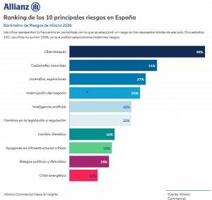 Allianz Commercial , firma del Grupo Allianz que gestiona seguros corporativos de grandes y medianas empresas y riesgos complejos, publica un año más el Barómetro anual de Riesgos de Allianz . Este informe, que recoge las principales preocupaciones para las empresas de pequeño, mediano y gran tamaño en España y a nivel global, revela que los incidentes cibernéticos encabezan la lista en 2026 como el riesgo más vital para las empresas del país, con un 48% de las respuestas , además de ser la principal preocupación también a nivel global un año más .En España, los siguientes puestos del ranking lo ocupan las catástrofes naturales con un 31% y los incendios con un 27%, aunque c abe destacar la presencia relevante de la inteligencia arti ficial (IA) que entra por primera vez en el top 10 y se sitúa en la quinta posición con un 22% de las respuestas obtenidas en el país.